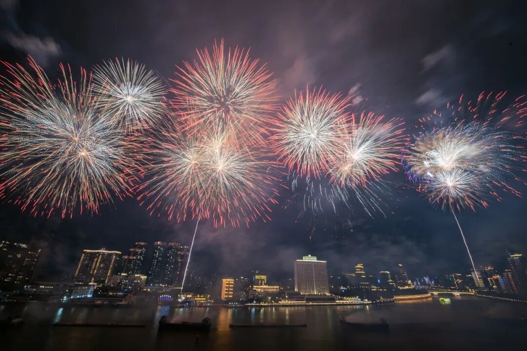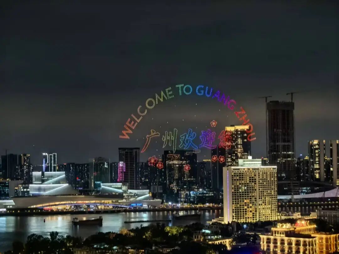 白鹅潭江面烟花绽放,无人机编队绘就新春画卷,江风拂面、灯火璀璨,把一整年的美好与祝福,都绽放在夜空。