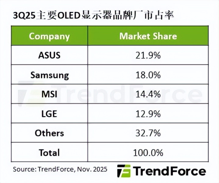 第三季度全球 OLED 显示器品牌市占率出现了显著变化: