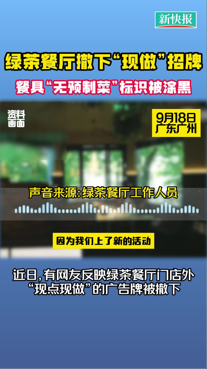 9月18日,新快报记者以消费者身份就此事致电了广州市内两家绿茶餐厅,接线的工作人员均表示撤下“现做”招牌是因为门店有上新活动,属于正常更换。当被问及外卖餐具上“无预制菜”标识为何会被涂成黑色时,其中一家店的工作人员称餐具包装亦会季节性更换,并表示餐厅菜品是现炒现做,明厨亮灶。